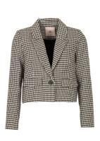 Voeg een klassieke twist toe aan je outfit met deze cropped blazer in pied-de-poule dessin. Gemaakt van een zachte jacquardkwaliteit, combineert dit item moeiteloos tijdloze elegantie met moderne flair. De schoudervullingen zorgen voor een krachtige, gestructureerde look, terwijl de korte lengte perfect balanceert met high-waisted broeken of rokken. De blazer is afgewerkt met een klassieke reverskraag, lange mouwen en een stijlvolle knoopsluiting. Details: Cropped blazer met lange mouwen Zachte jacquardstof met pied-de-poule patroon Voorzien van schoudervulling voor een krachtig silhouet Klassieke reverskraag en knoopsluiting Materiaalsamenstelling: 100% polyester Model is 175 cm en draagt maat S