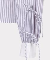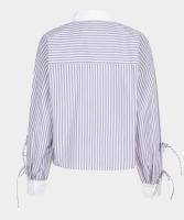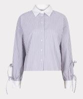 Speelse cropped blouse met streepjes en glinsterende strass steentjes. De blouse heeft strikjes aan de mouwen, een witte reverskraag, witte manchetten en is gemaakt van 100% katoen. Model is 1.73m en draagt maat S.