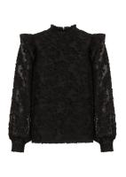 De Bambie Blouse is gemaakt van een zachte polyesterstof met subtiele haartjes, biedt deze blouse een rijke textuur en een elegante uitstraling. Het opstaande kraagje en de ruffle-details op de schouders zorgen voor een vrouwelijke, eigentijdse twist. De transparante mouwen voegen een luchtig contrast toe aan het gestructureerde lijfje. Perfect voor een avond uit of als statement piece in een stijlvolle dagelijkse look. Details: Blouse met opstaand kraagje Ruffles op de schouders Transparante mouwen met manchetten Zachte stof met fijne textuur Materiaalsamenstelling: 100% polyester Model is 175 cm en draagt maat S