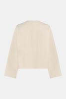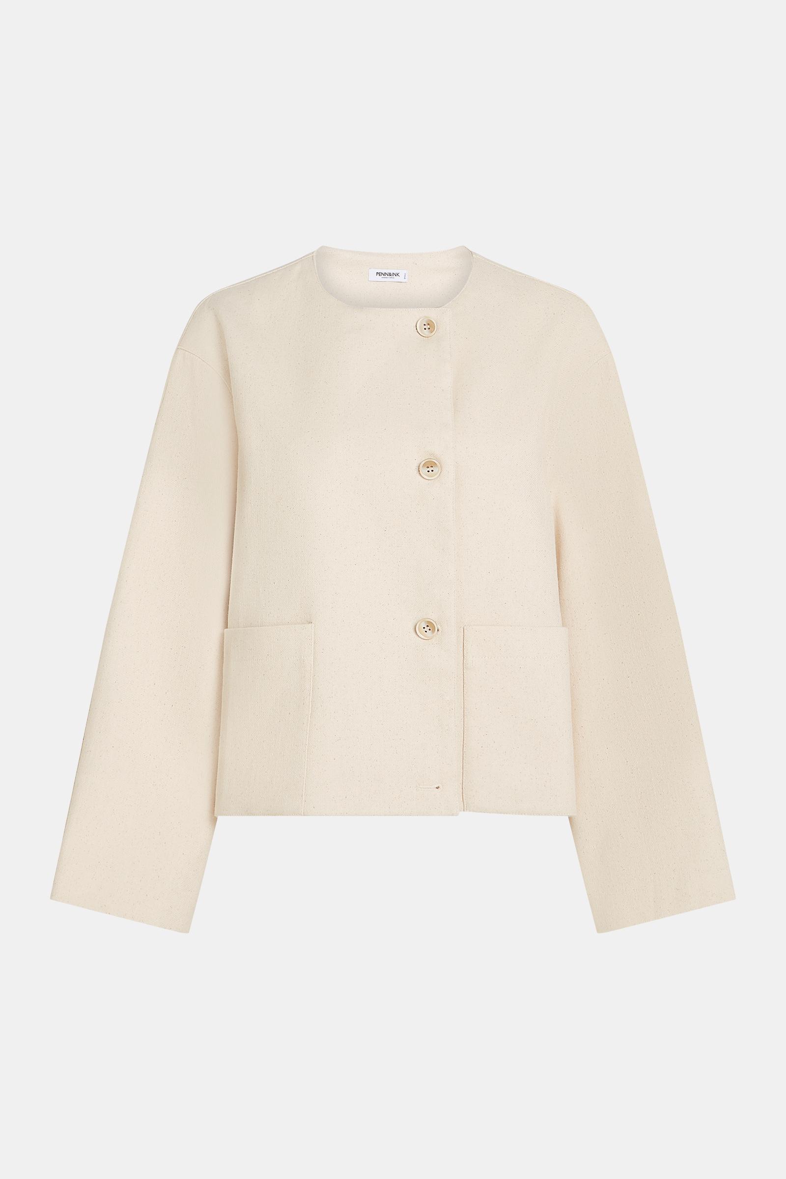 This ecru jacket is designed with a clean, minimalist silhouette and a slightly boxy fit. Featuring a round neckline and a three-button front closure, it offers a modern, refined look. Boxy fit Three-button closure Patch pockets