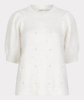 Fijne kabeltrui met ballon mouwen en kleine clusters van pareltjes. Model is 1.73m en draagt maat S.